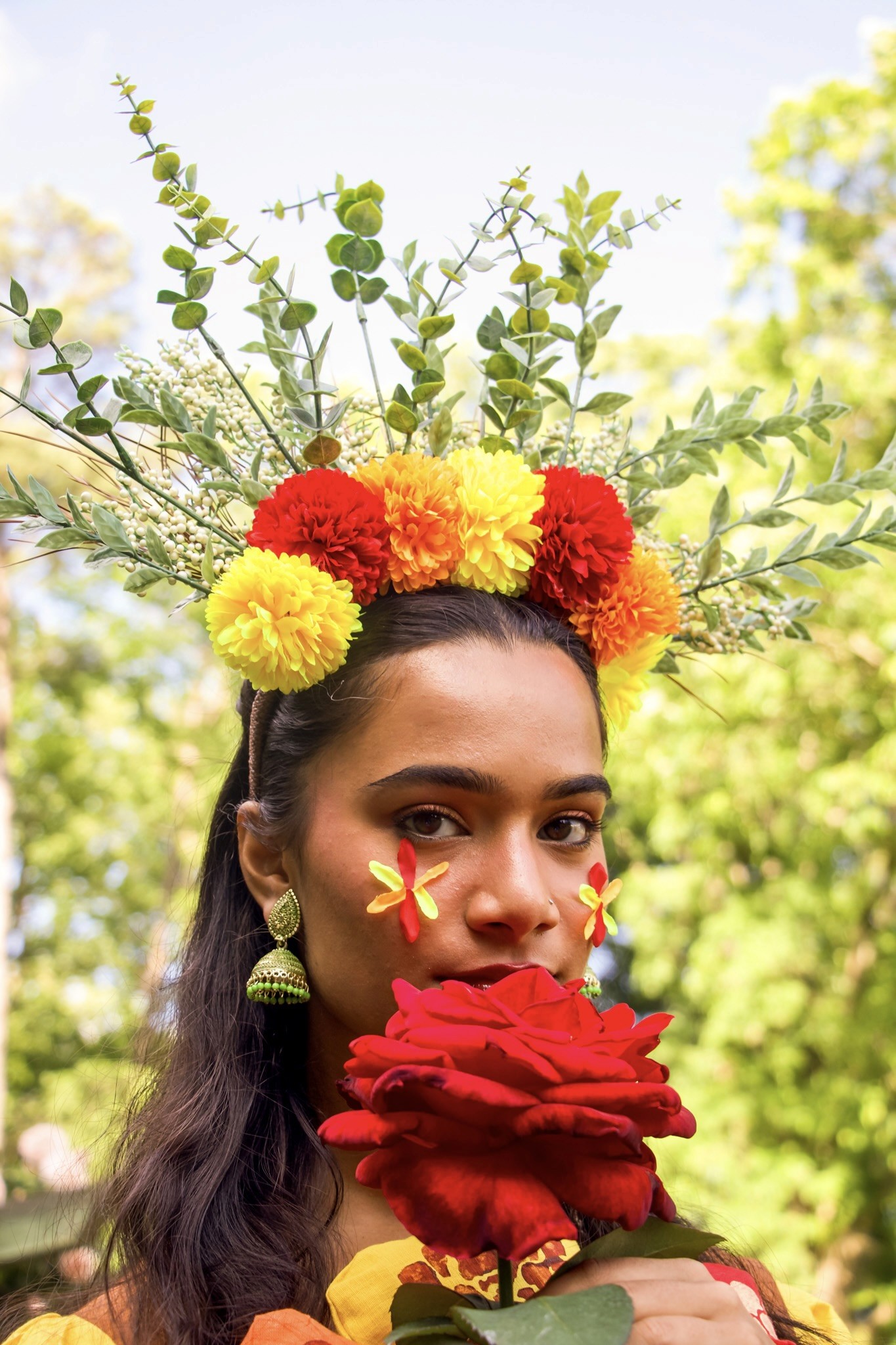 Cosutme contruction depicting themes of life through hand-dyed and block printed fabrics.